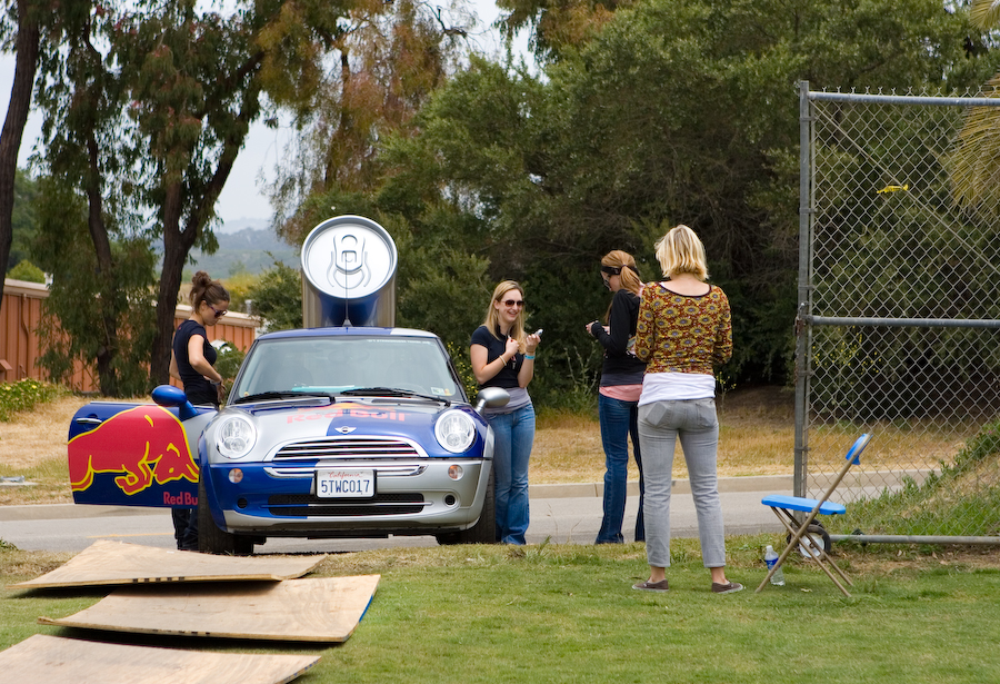 The women of Red Bull call all of their friends to see who brought the giant can of mixer.