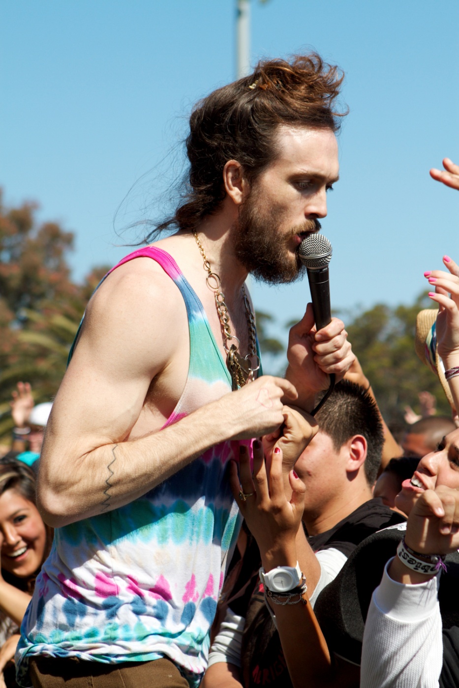 Alex explains that his jewelry is made of parts of used cars he's driven off cliffs.