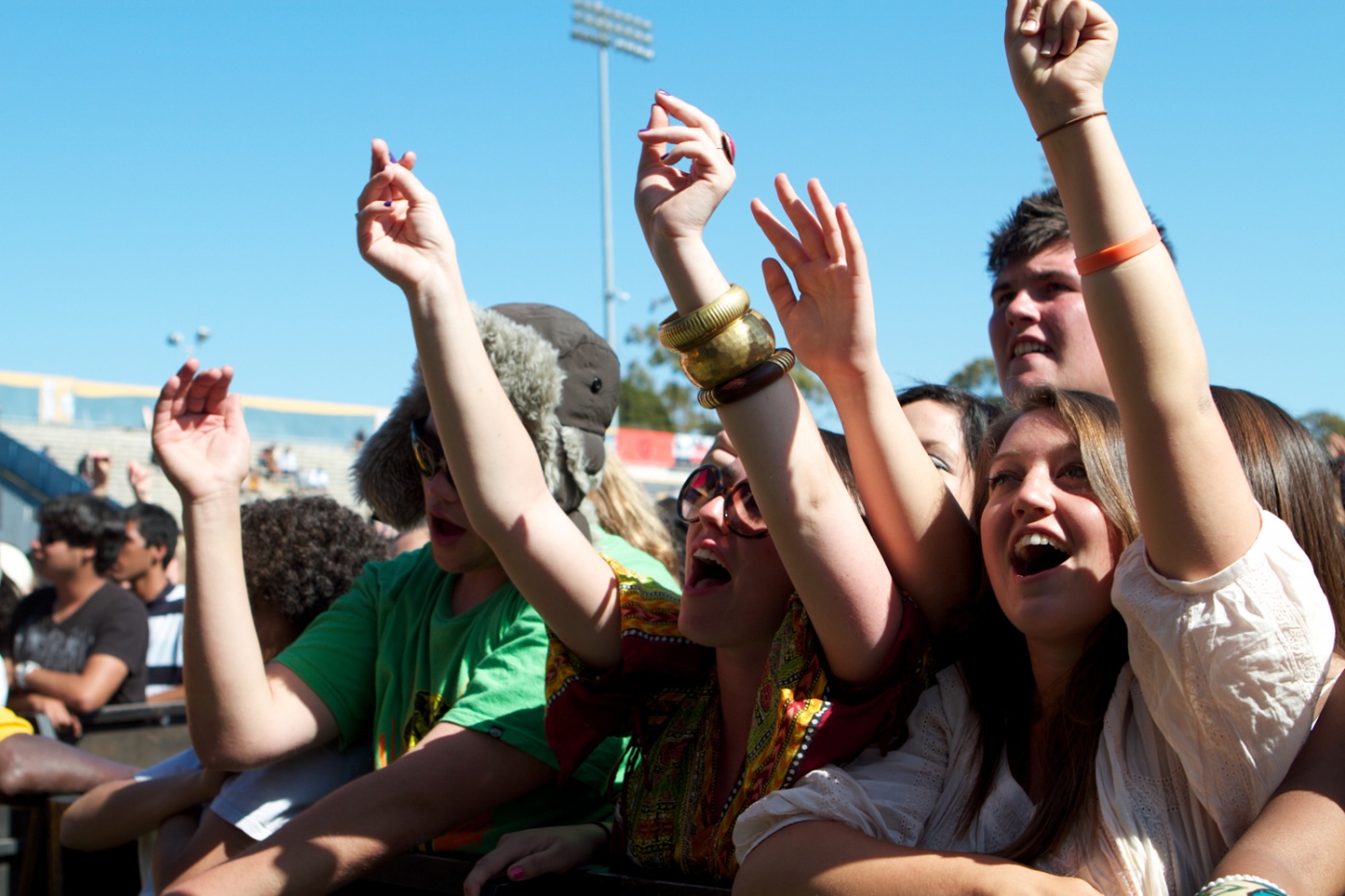 The crowd cheers while hat guy starts to lose energy due to the heat.